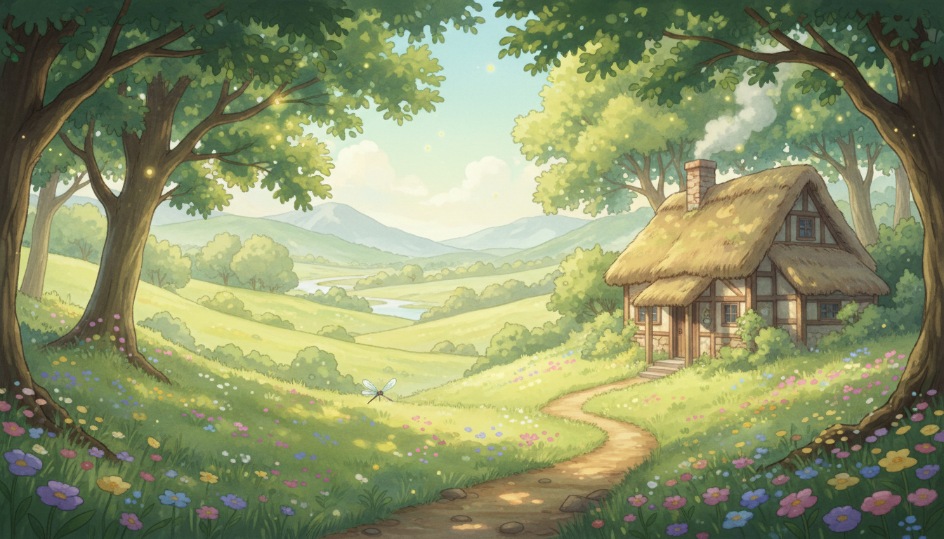 “Studio Ghibli style artwork, peaceful countryside, soft colors, hand-painted look, anime background”